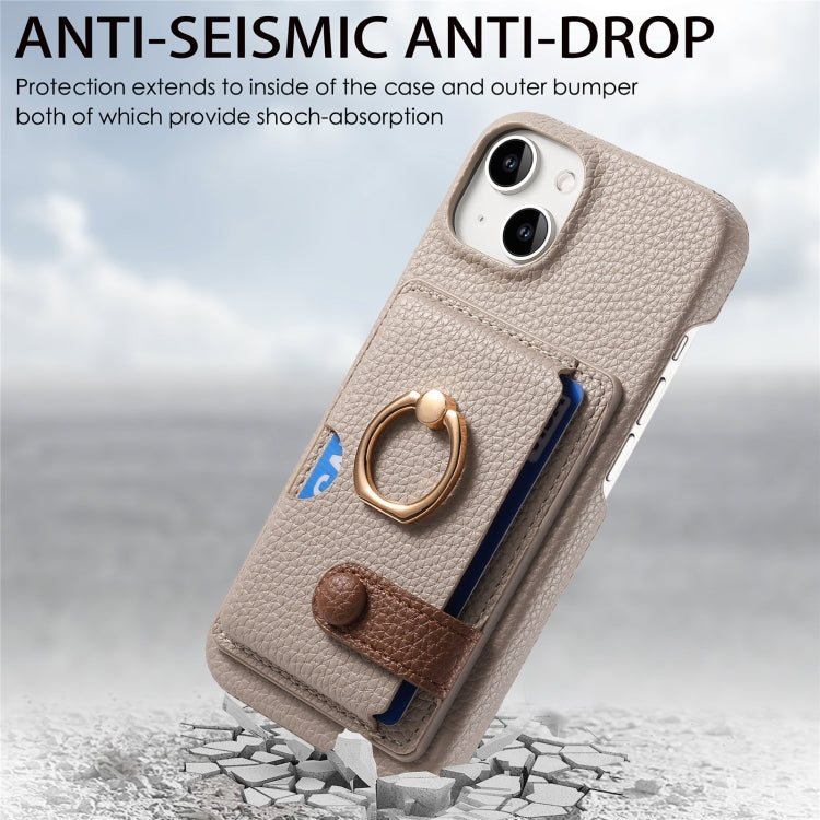 For iPhone 15 Plus Phone Case with Card Back with Ring and Litchi Leather Oil Edge (Khaki)