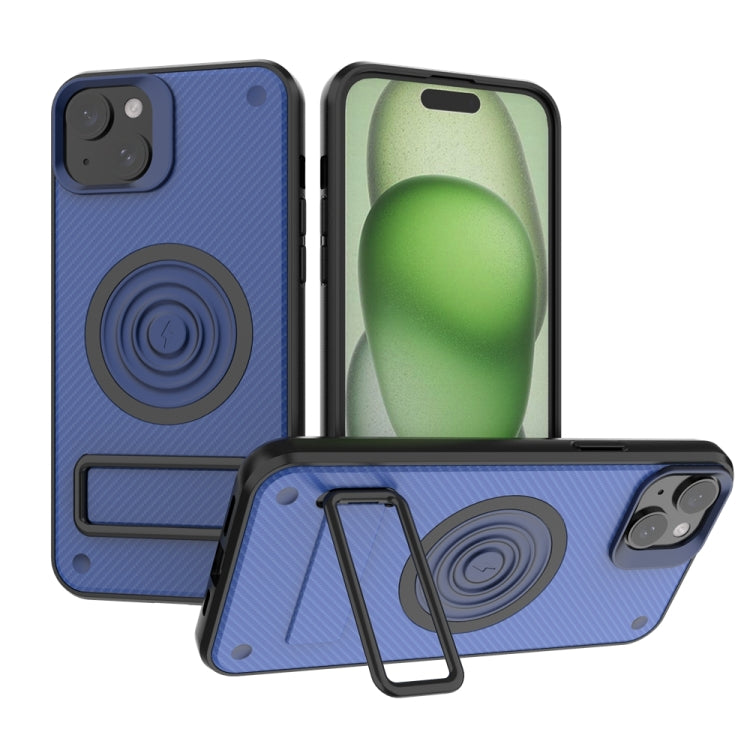 Funda para Teléfono iPhone 15 Plus PC + TPU con Textura de Fibra de Carbono y Soporte de Metal (Azul)