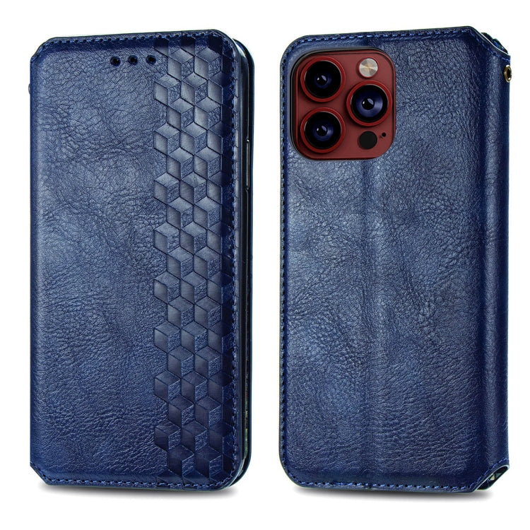 Funda para teléfono iPhone 15 Pro Max Cubic Grid Cuero Magnético Prensado (Azul)