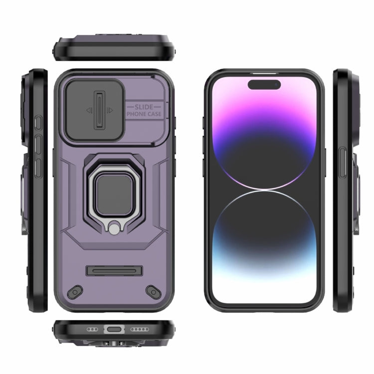Estuche para teléfono iPhone 15 Pro TPU + PC Sliding Camshield a prueba de golpes con soporte (Púrpura)