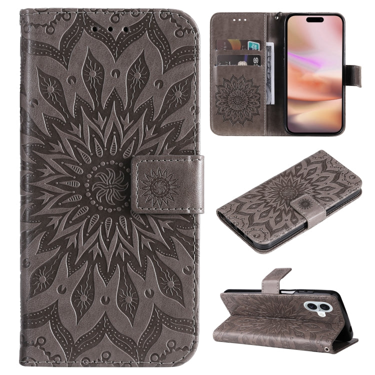 Funda para Teléfono iPhone 16 Plus Cuero con Tapa Patrón de Girasol En Relieve (Gris)