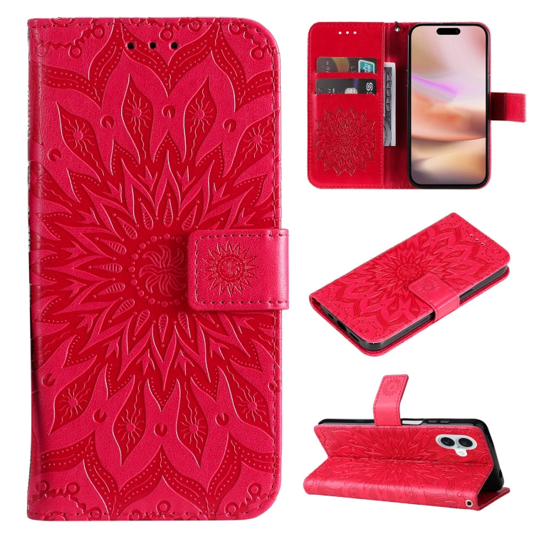 Funda de Cuero para iPhone 16 Plus con Tapa y Patrón de Girasol en Relieve (Rojo)