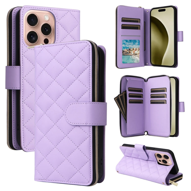 Funda para Teléfono iPhone 16 Pro Cuero Hebilla Torre Cremallera Rombal Cruzada Cordón (Púrpura)