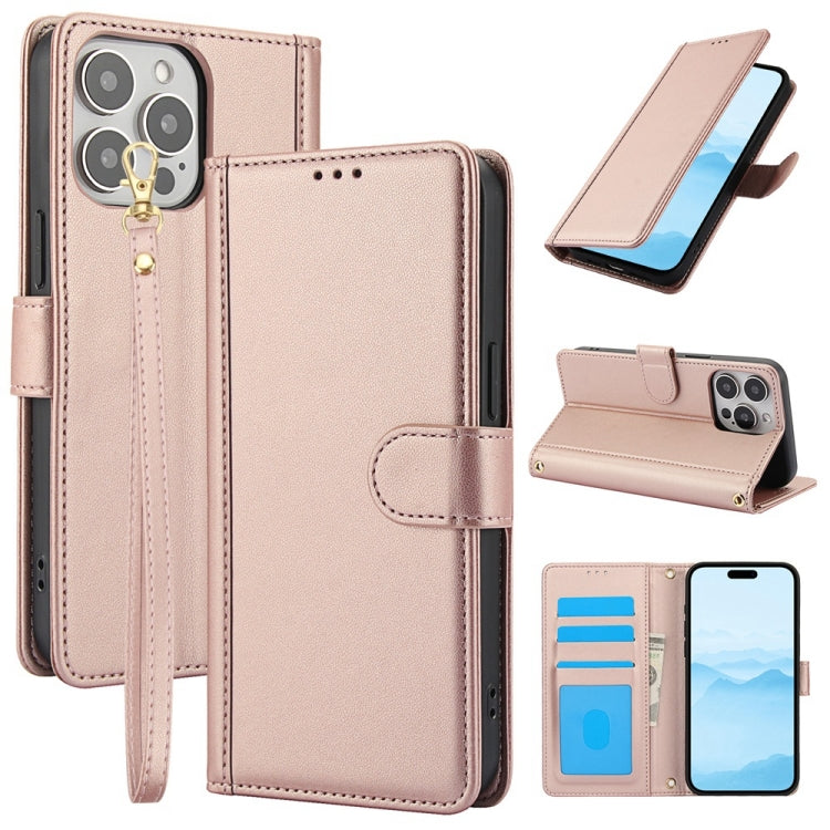 Funda de Cuero para iPhone 16 Pro con Ranuras para Tarjetas y Cordón Doble (Oro Rosa)