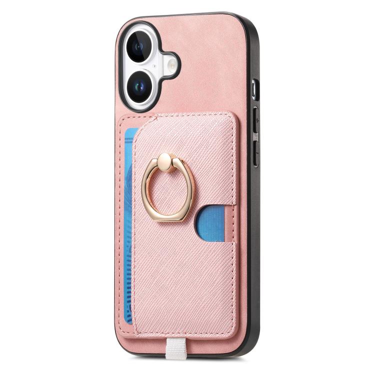Funda para iPhone 16 con Ranuras para Tarjetas Diseño Retro Cruz Anillo Lateral (Rosa)