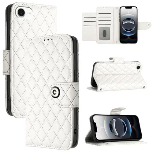 Funda de Cuero para iPhone 16E con Tapa Textura Rómbica y Cordón (Blanco)