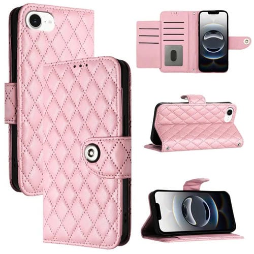 Funda de Cuero con Tapa y Textura Rombal para iPhone 16E con Cordón (Rosa)