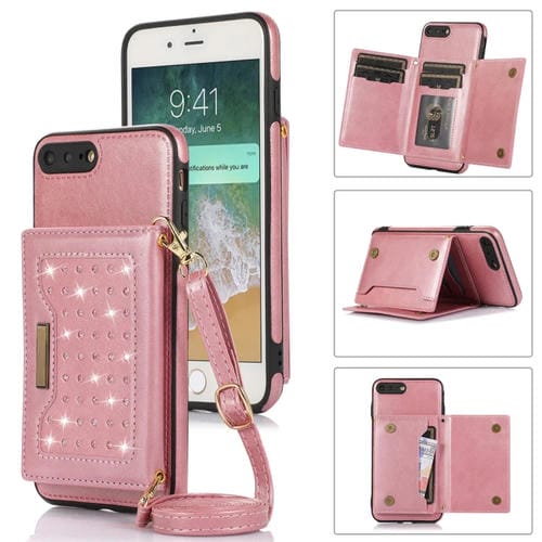 For iPhone 7 Plus/8 Plus Tri-fold RFID Leather Phone Case with Lanyard (Rose Gold)