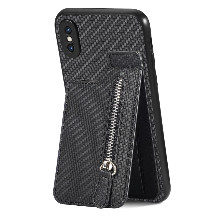 Funda de teléfono para iPhone X Xs con cremallera vertical de fibra de carbono (Negro)