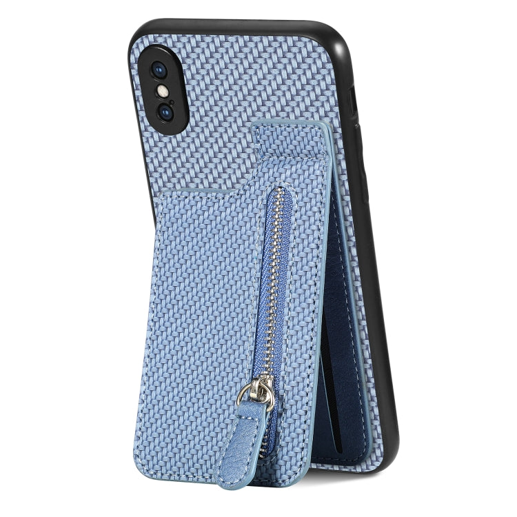 Funda de teléfono iPhone X Xs con cremallera vertical fibra de carbono (Azul)