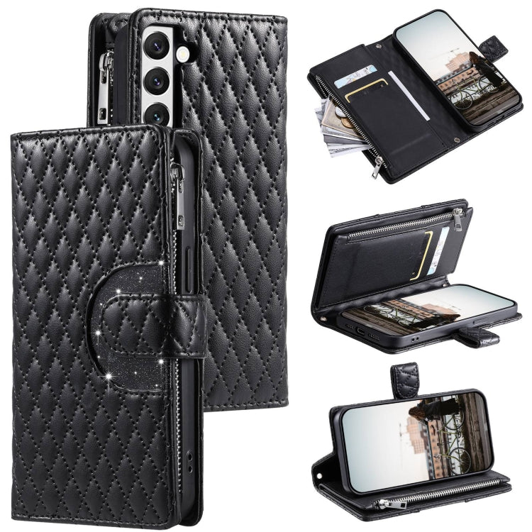 Estuche de Cuero Samsung Galaxy S22 + 5G con Billetera, Cremallera y Celosía con Purpurina (Negro)