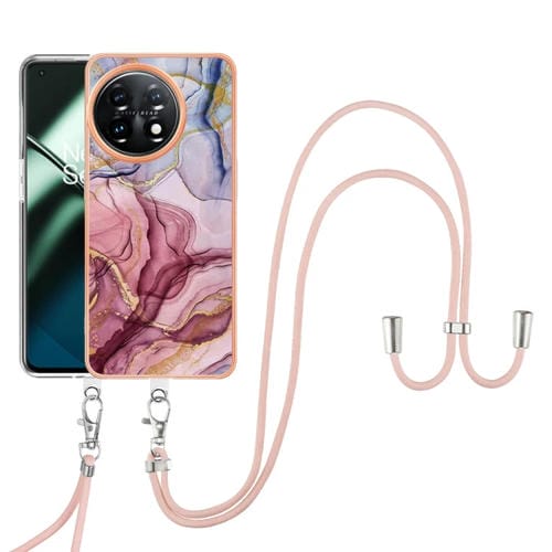 For OnePlus 11 Electroplated Marble Double-sided IMD Phone Case with Lanyard (Rose Red 014)