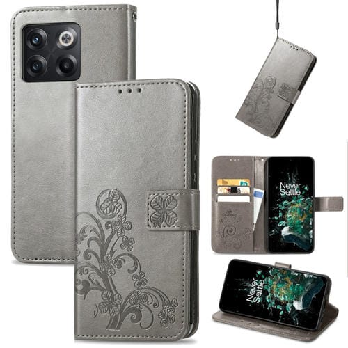 Estuche para OnePlus 10T de Cuero con Hebilla en Relieve y Cierre de Cuatro Hojas (Gris)