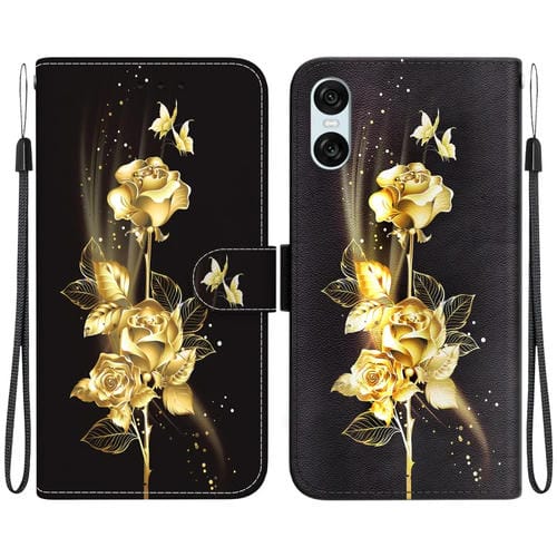 Estuche para Sony Xperia 10 Vi de Cuero con Dibujo Coloreado y Textura de Cristal (Mariposa Dorada Rosa)