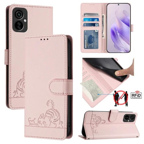 Estuche para Tecno Camon 19 Neo Cat Rat de Cuero Rfid con Patrón en Relieve y Cordón (Rosa)