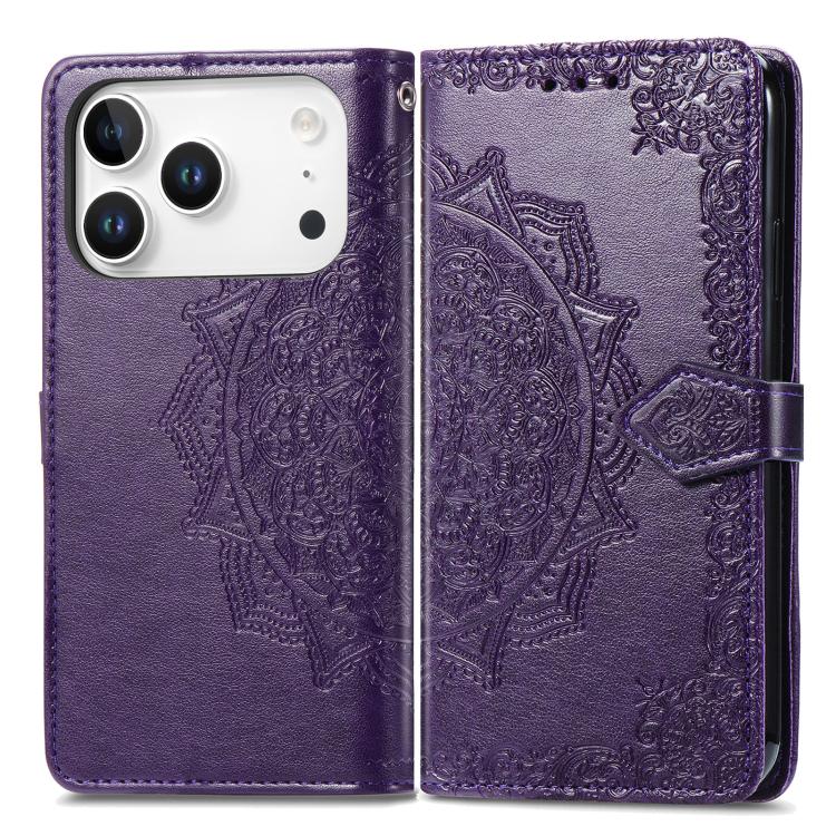 Funda de cuero con relieve de flor de mandala para iPhone 17 Pro Max (morado)