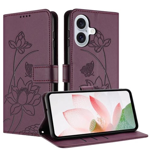 Funda de piel con relieve de loto para iPhone 17 con cordón (rojo vino)