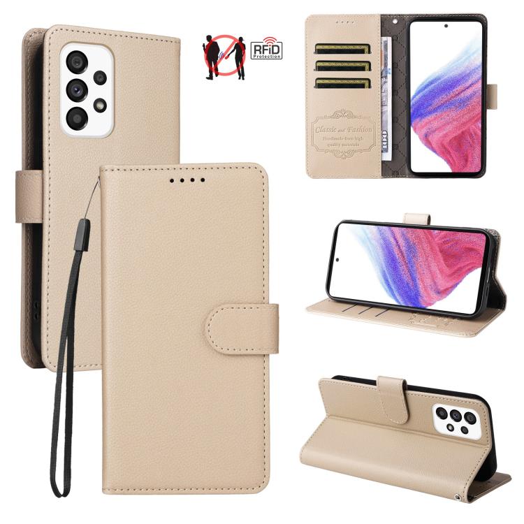 Funda de cuero tipo billetera con textura Litchi y bloqueo RFID para Samsung Galaxy A53 5G (beige)