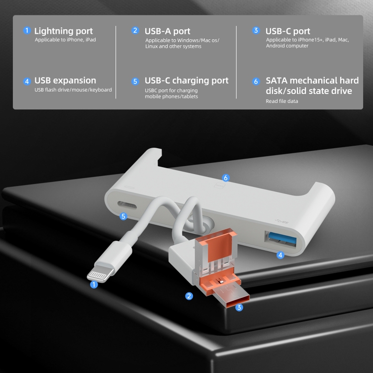 El adaptador multifunción NK-1046TL Pro es un convertidor especialmente desarrollado para los amantes del teatro y los trabajadores de oficina que están acostumbrados a los discos duros móviles.Las interfaces tipo C, USB y SATA de los adaptadores permiten a los usuarios realizar copias de seguridad de archivos en el disco duro de los dispositivos móviles con facilidad, al tiempo que garantizan la duración de la batería del dispositivo, ver audio y video y ampliar la diversidad de funciones periféricas USB (el adaptador debe enchufarse al cable de carga tipo C en el dispositivo de 8 pines para operar la interfaz SATA).