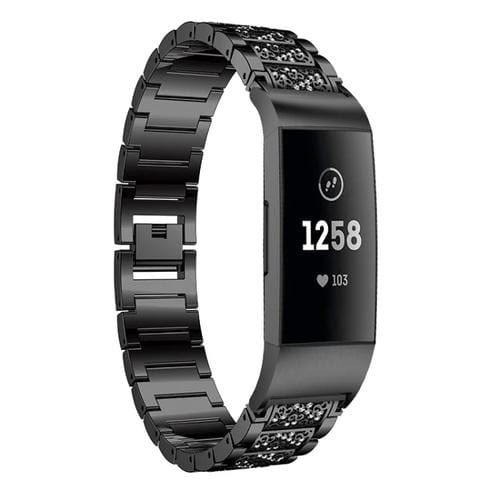 Banda de reloj de acero inoxidable sólido con tachuelas de diamante para Fitbit Charge 3 (negro)