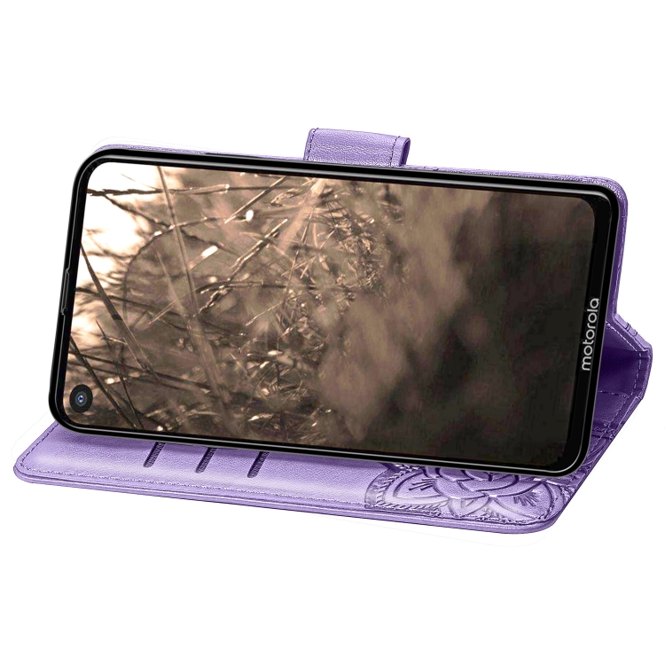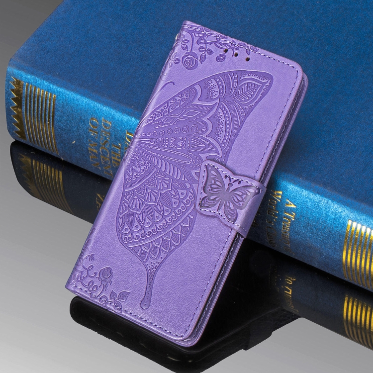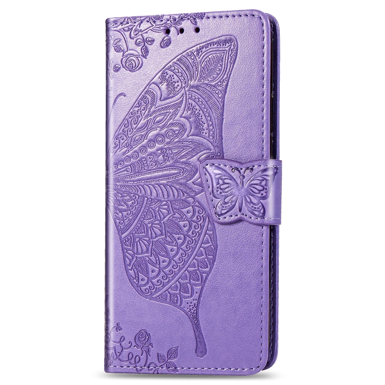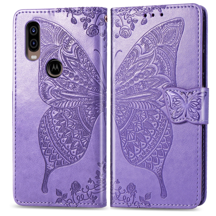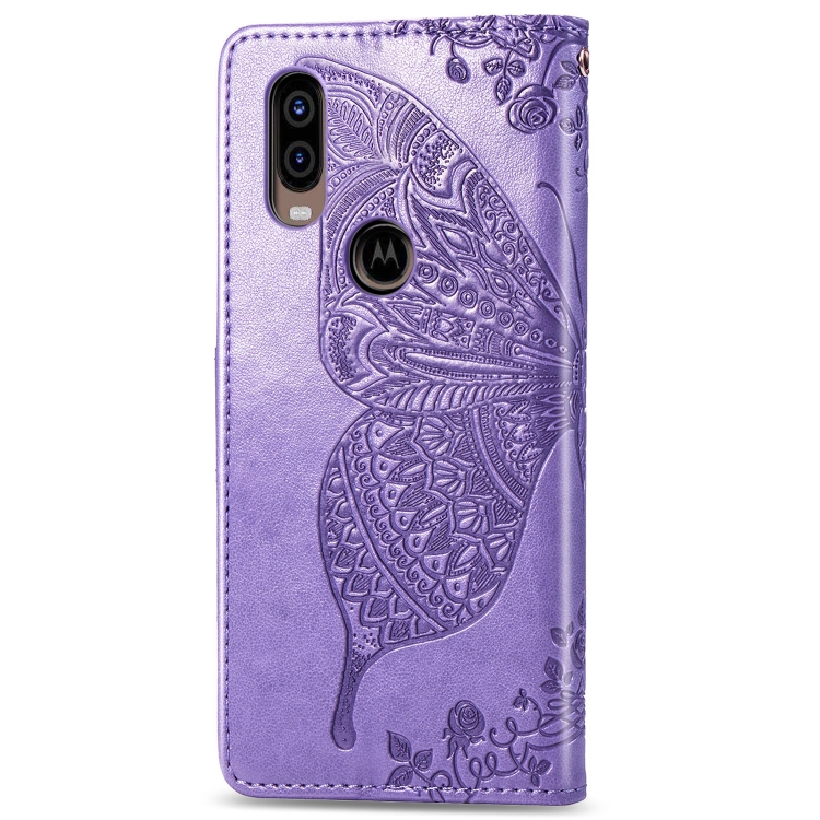 Funda de Cuero Butterfly Love Flowers para Motorola P40 con Tapa Horizontal, Soporte, Ranuras y Cordón (Violeta Claro)