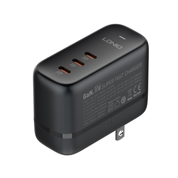 Cargador de interfaz Ldnio Q367 65W Gan 3 x Usb-C con cable de datos Usb-C a Usb-C (Negro)