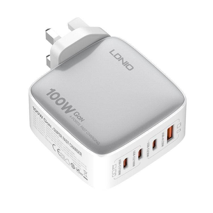 Cargador USB+3 USB-C Gan 100 W Ldnio Q408 con Cable USB-C a USB-C (Blanco)
