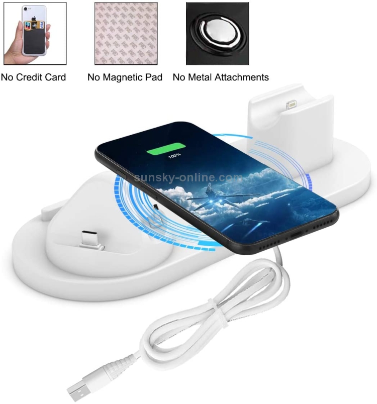 1. Soporte de cargador inalámbrico 6 en 1. El soporte del cargador multifunción con interfaz iPhone / Micro / Type-C puede cargar casi todos los dispositivos móviles, como iPhone, iPad, Samsung, LG, HTC, Huawei, Sony y el coaxial de carga puede girar 360 grados libremente al mismo tiempo. Para cargar 4 dispositivos, se requiere el adaptador QC2.0 / 3.0