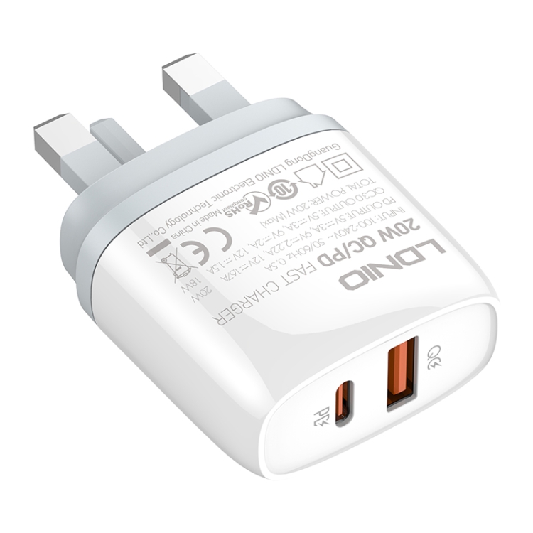 Cargador Rápido Usb + Tipo C Ldnio Q229 Qc3.0 Pd20W con Cable Tipo C a 8 Pines 1 m (Blanco)
