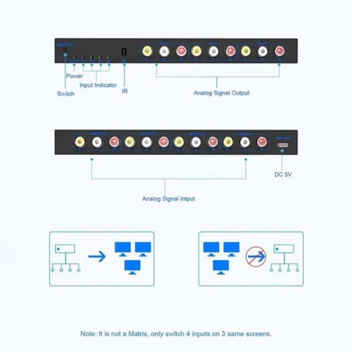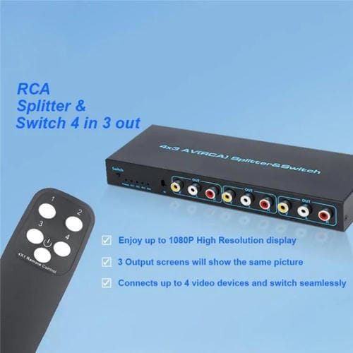 - 1x Conmutador AV Compuesto RCA 4 Entradas 3 Salidas Caja Divisora Señal Audio Vídeo Enchufe Europeo