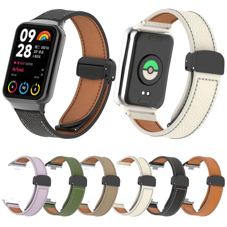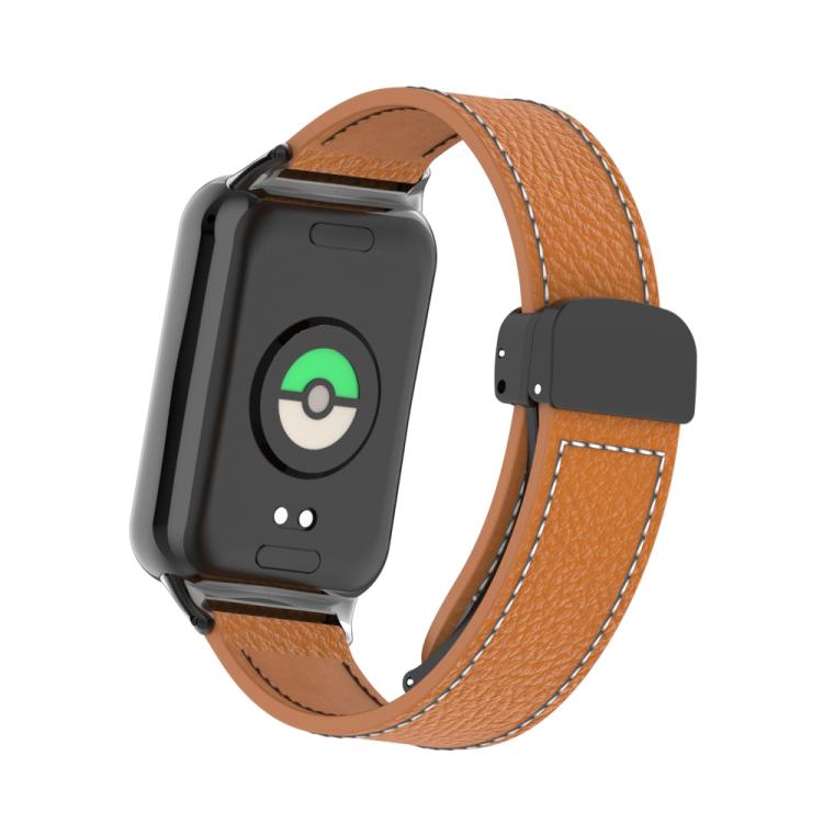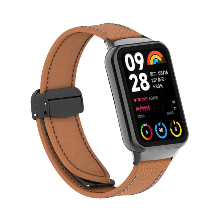 Correa de cuero con hebilla magnética negra y textura de lichi para Xiaomi Smart Band 9 Pro y Redmi Watch 5 (marrón)