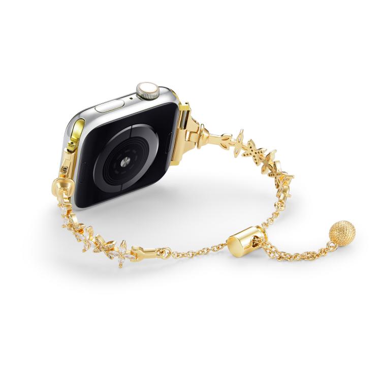 Correa de reloj de aleación de zinc con diamantes y trébol de cuatro hojas para Apple Watch de 42 mm, 41 mm, 40 mm y 38 mm (dorada)