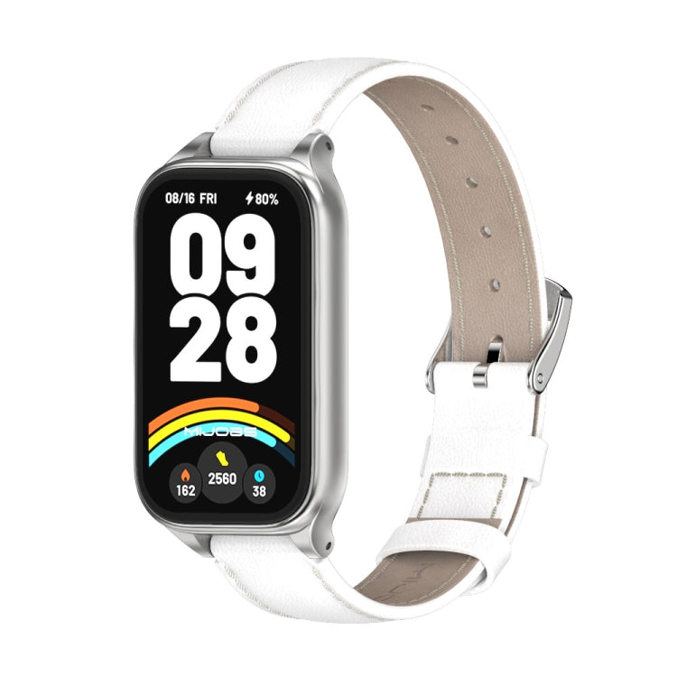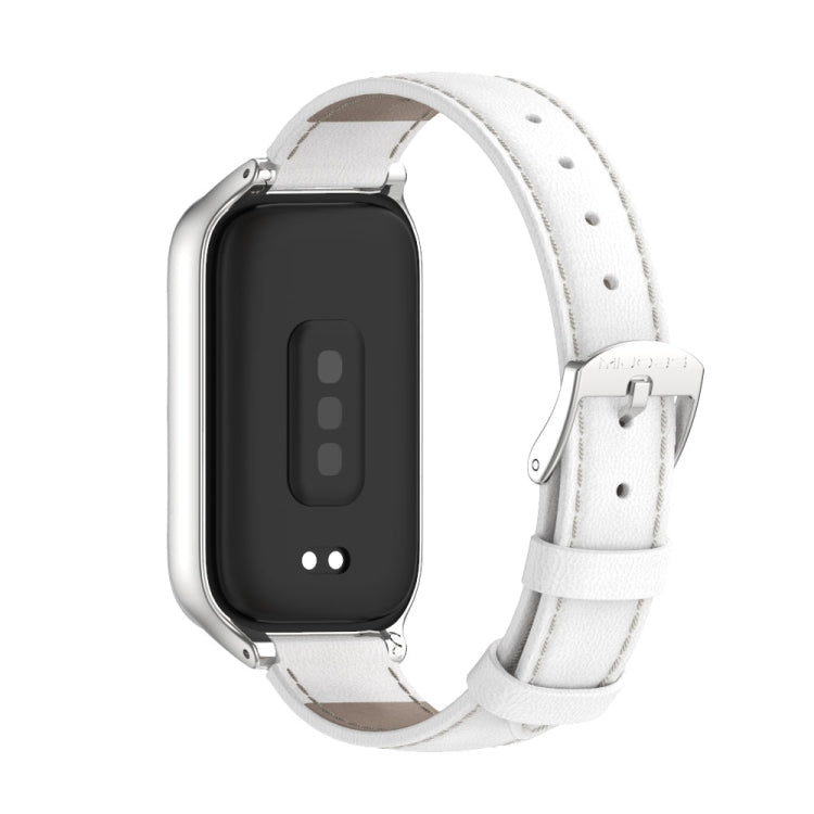 Correa de reloj de cuero genuino con carcasa de metal Mijobs para Xiaomi Smart Band 9 Active / Redmi Band 3 (blanco y plateado)
