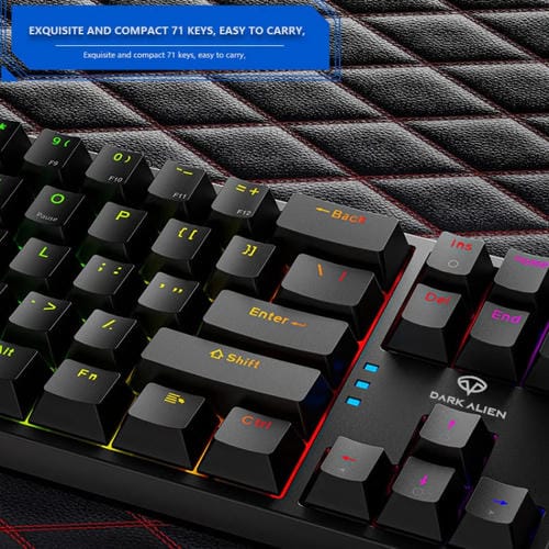 El Teclado gaming Dark Alien K710 es un Teclado mecánico compacto de 71 teclas diseñado para usuarios que requieren precisión y durabilidad en sus sesiones de Juego. Cuenta con un sistema de retroiluminación RGB con 9 efectos de luz personalizables y una tira de luz lateral que proporciona una experiencia visual atractiva. Este modelo utiliza ejes mecánicos verdes y rosas, conocidos por su sensibilidad y tacto definido, ideales para Juegos que demandan respuestas rápidas. Su diseño incluye un Cable independiente tipo C de 1,8 metros para una Conexión plug and play sencilla y práctica. Además, dispone de un trípode ajustable de doble extremo para adaptar la inclinación según la preferencia del usuario, facilitando la ergonomía durante largas horas de uso.