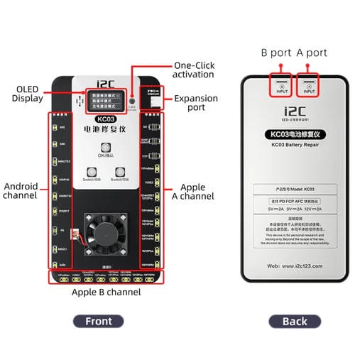 El dispositivo de reparación de detección y activación de Batería multifunción i2C KC03 es una herramienta profesional diseñada para la reparación y calibración de Baterías en dispositivos Móviles Apple y Android. Compatible con modelos desde iPhone 6 hasta iPhone 15 Pro Max, así como con más de 400 modelos de Android, incluyendo Xiaomi, Huawei, Meizu, VIVO y OPPO, este equipo permite la Carga, desCarga y calibración simultánea de dos Baterías mediante canales duales independientes, mejorando la eficiencia del proceso en un 100%. Su función principal es resolver problemas comunes de Baterías como la falta de Carga, inactividad o dispositivos que no se encienden, mediante un sistema avanzado que soporta Carga rápida PD y QC con una Corriente máxima de 4A, garantizando una Carga eficiente sin dañar las Baterías. Además, ofrece monitoreo en tiempo real de voltaje, Corriente, potencia, capacidad, estado y ciclos de trabajo, con actualización remota OTA para mantener el software siempre al día. El diseño incluye un sistema de refrigeración por Ventilador para mantener la temperatura óptima durante el uso prolongado, y Soportes distribuidos para una correcta acomodación de las Baterías.