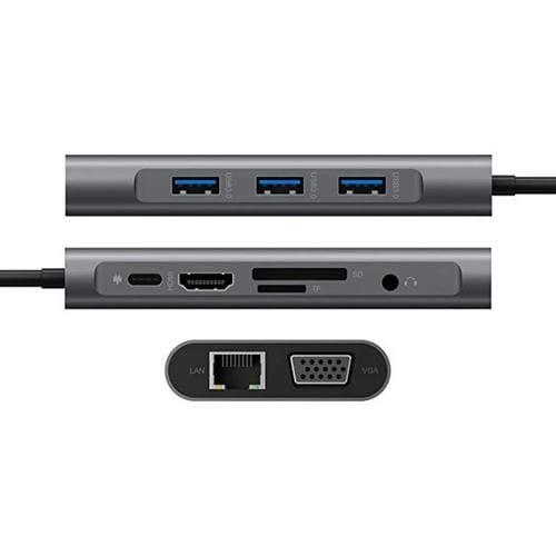 • Puertos: 3x USB 3.0 (5 Gbps), HDMI 4K UHD (3840x2160 @ 30Hz), VGA HD (1920x1080 @ 60Hz), ranuras para Tarjeta SD y TF UHS-1 (104 MB/s), RJ45 Gigabit Ethernet (10/100/1000 Mbps), audio/Micrófono 3,5 mm, salida de Potencia PD (hasta 100 W); dimensiones 26,5 x 6,2 x 1,8 cm; peso 100 gramos