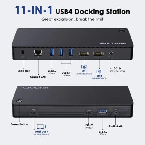 • Incluye Puertos DisplayPort 8K y 4K, Carga PD IN de 130W, USB 3.1-C y USB 3.1-A de 10 Gbps, USB 3.0-A de 5 Gbps, Puerto Gigabit Ethernet, Conector telefónico de 4 polos y ranura para candado; transferencia de datos hasta 40 Gbps; Soporte para dos monitores 4K a 60Hz o un monitor 8K a 30Hz; Cable USB-C de 40 Gbps incluido; plug-and-play sin necesidad de controladores