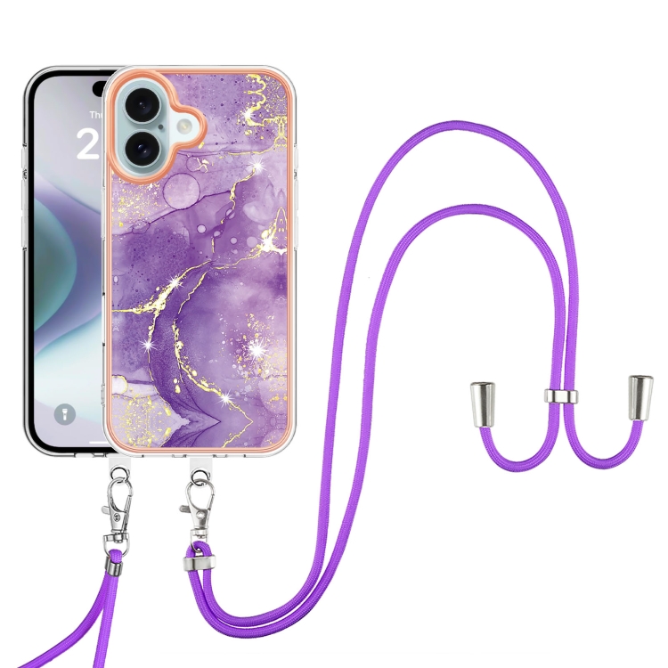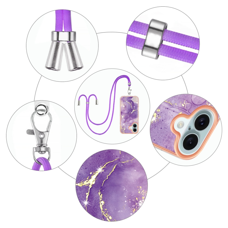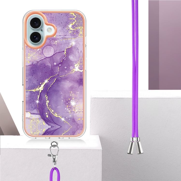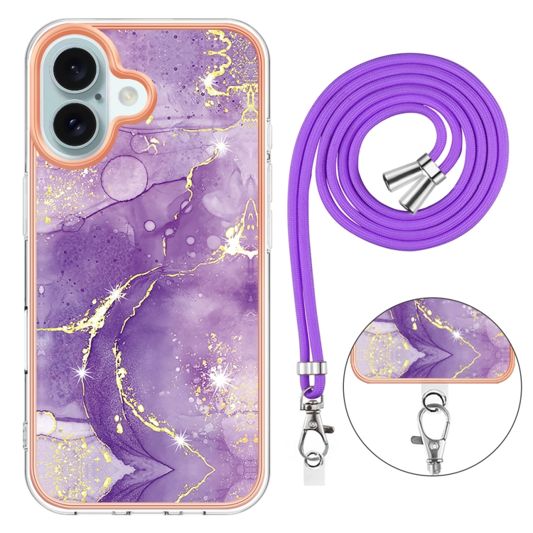 Estuche para Teléfono Imd Doble Cara con Revestimiento Mármol Galvanizado para iPhone 16 con Cordón (Púrpura)