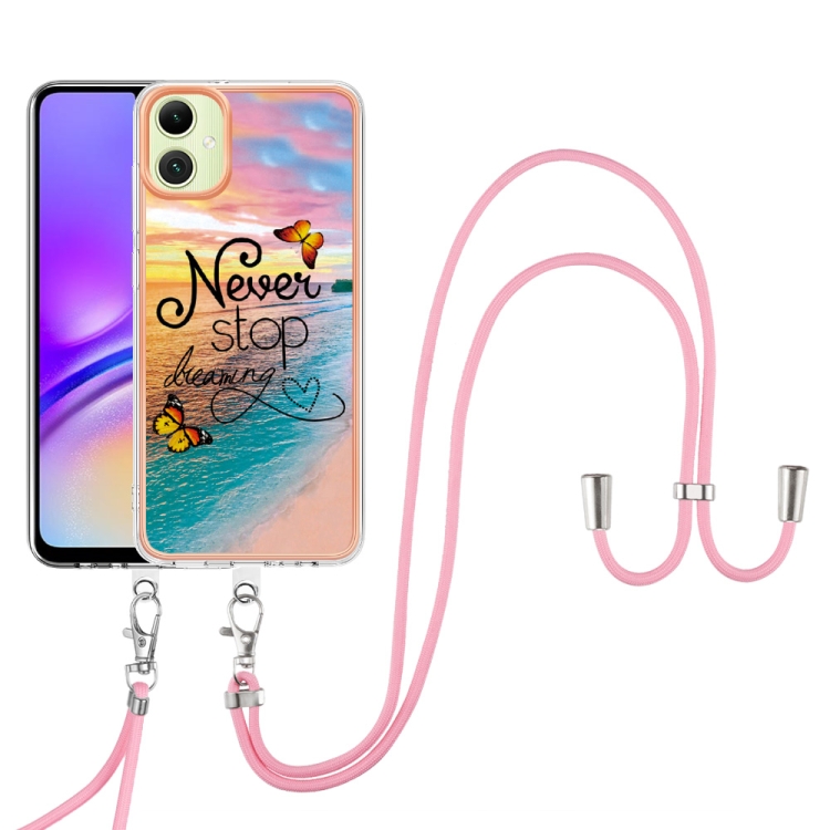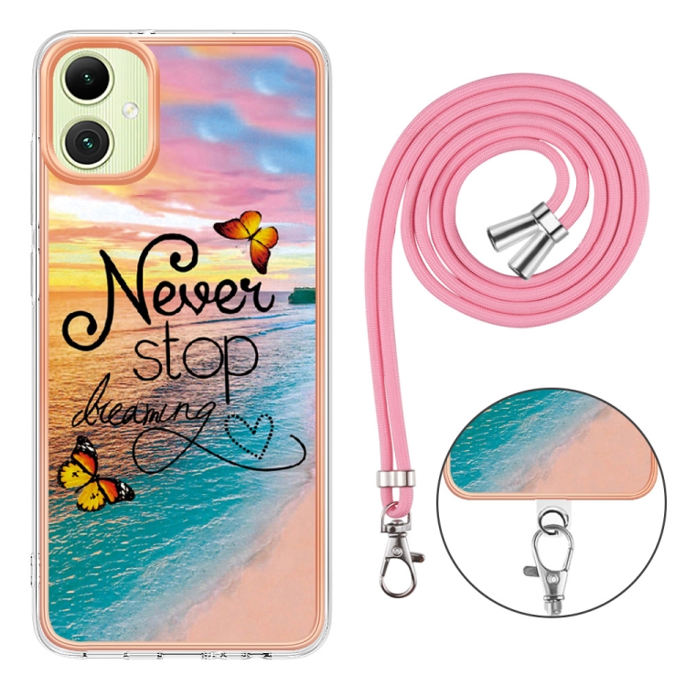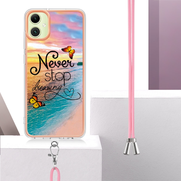 Funda a prueba de golpes TPU Samsung Galaxy A06 4G con patrón galvanoplastia y cordón (Mariposa Persiguiendo Sueños)