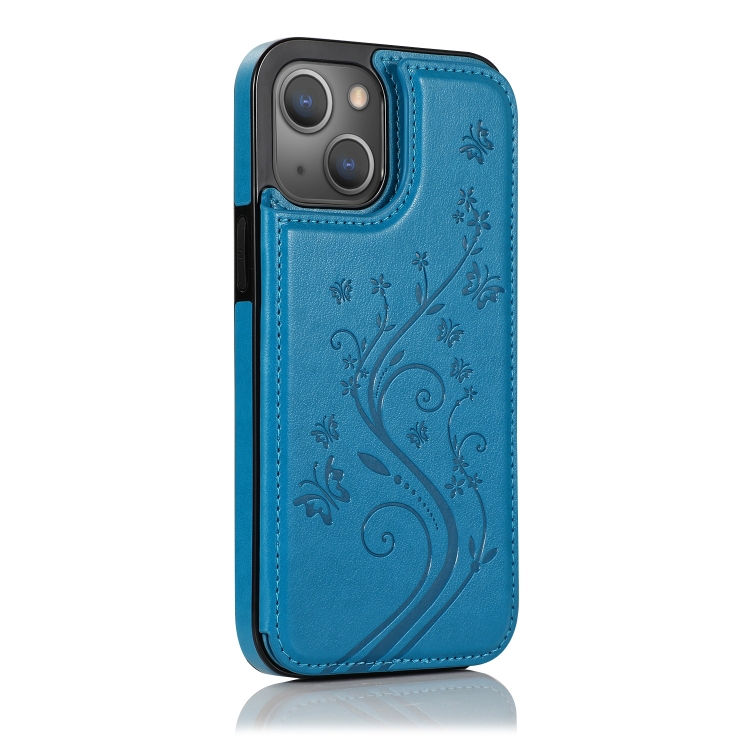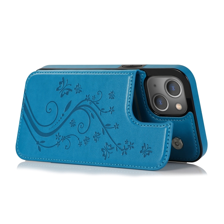 Funda con Doble Hebilla para iPhone 14 con Mariposas y Flores (Azul)
