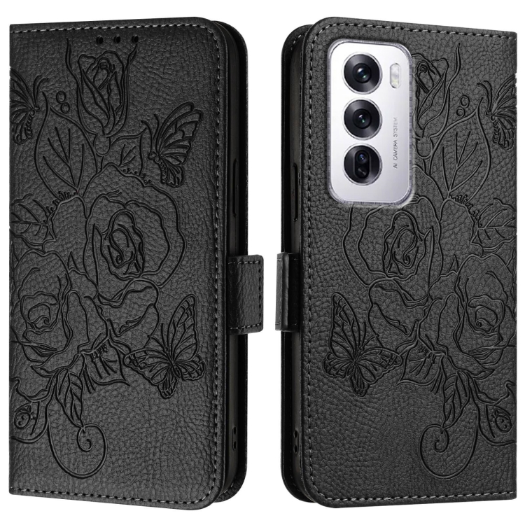 Funda de Cuero Antirrobo con Diseño de Rosa En Relieve para Oppo Reno12 Global (Negra)