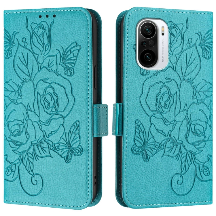 Funda de Cuero Antirrobo con Diseño de Rosa En Relieve Rfid para Redmi K40/K40 Pro (Azul Claro)