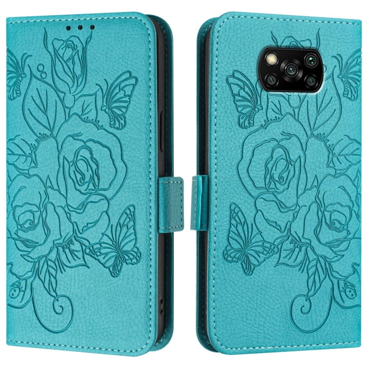 Funda de Cuero Antirrobo con Diseño de Rosa En Relieve Rfid para Xiaomi Poco X3 / X3 Nfc / X3 Pro (Azul Claro)