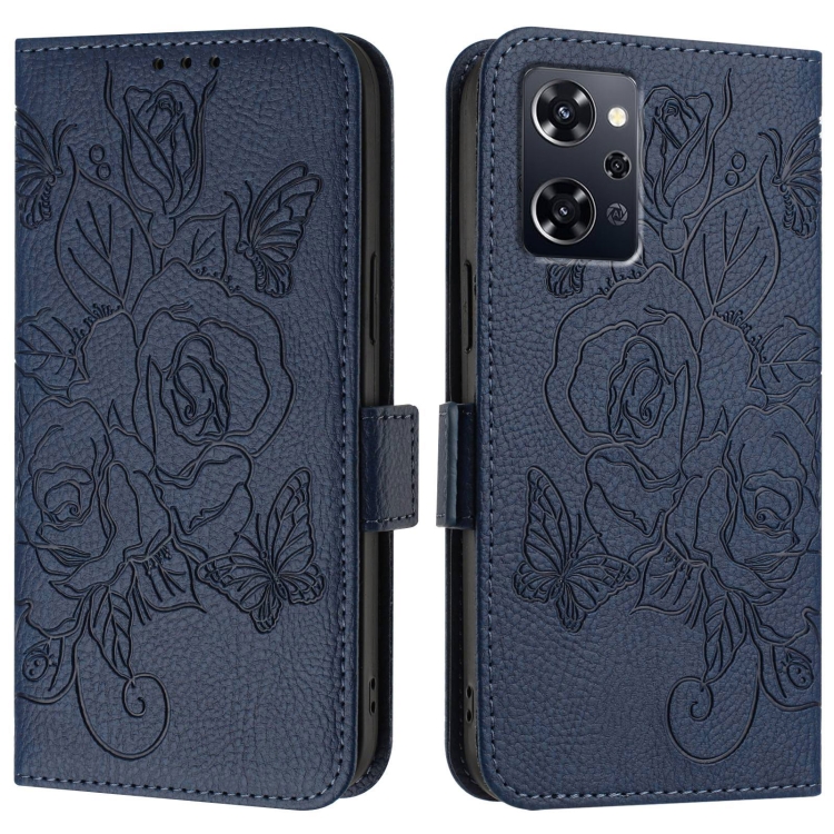 Funda de Cuero Antirrobo con Rfid y Diseño de Rosas En Relieve para Oppo Reno9 (Azul Oscuro)
