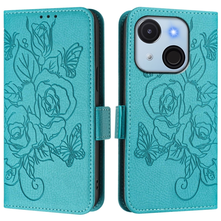 Funda de Cuero Antirrobo Rfid para Teléfono Itel A50C con Diseño de Rosa en Relieve (Azul Claro)