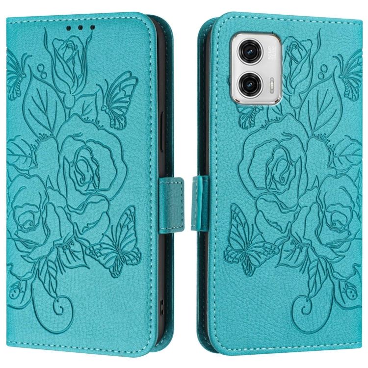Funda de Cuero Antirrobo RFID con Relieve para Motorola Moto G73 (Azul Claro)