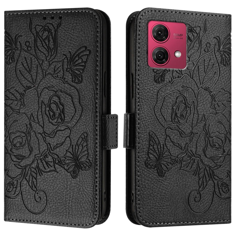 Funda de Cuero Antirrobo RFID con Relieve en Rosa para Motorola Moto G84 5G (Negra)