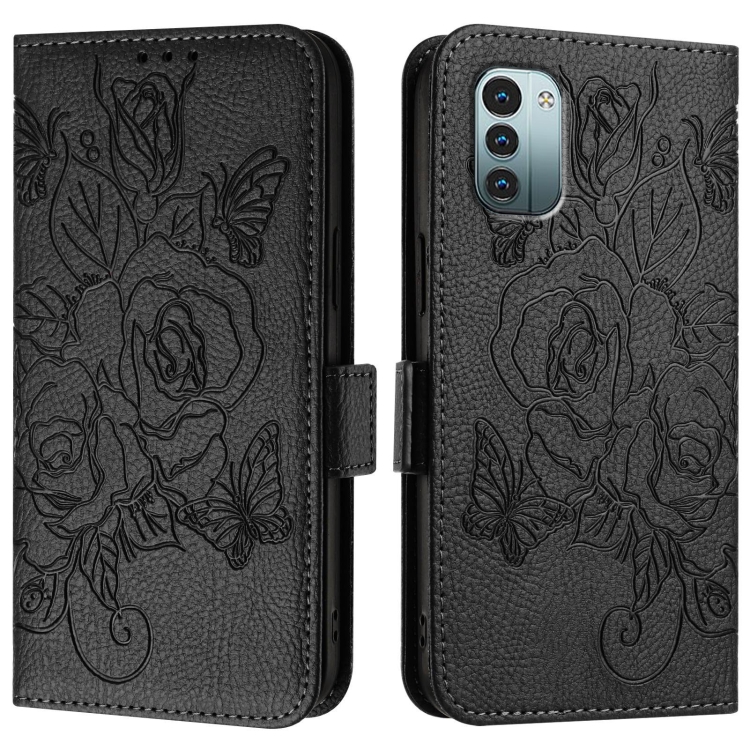 Funda de Cuero Antirrobo RFID con Relieve en Rosa para Nokia G11 4G y G21 4G (Negra)