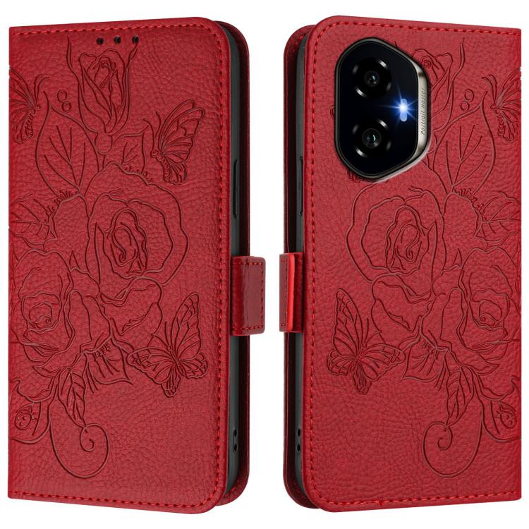 Funda de Cuero Antirrobo RFID con Relieve para Honor 300 5G (Rojo)