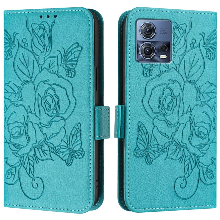 Funda de Cuero Antirrobo RFID con Relieve Rosa para Motorola Moto S30 Pro 5G (Azul Claro)